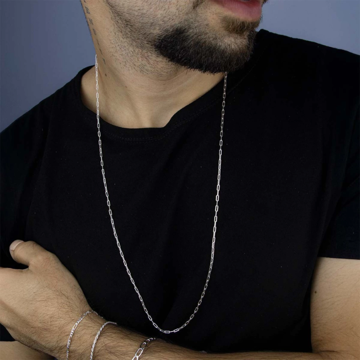 3. Posso usar duas correntes juntas? Com certeza! O layering (camadas) está super em alta no universo masculino. A dica é usar comprimentos diferentes para elas não ficarem emboladas. Tente combinar uma corrente de 60cm (mais grossa ou com pingente) com uma de 70cm (mais fina e lisa). O efeito visual é incrível.
