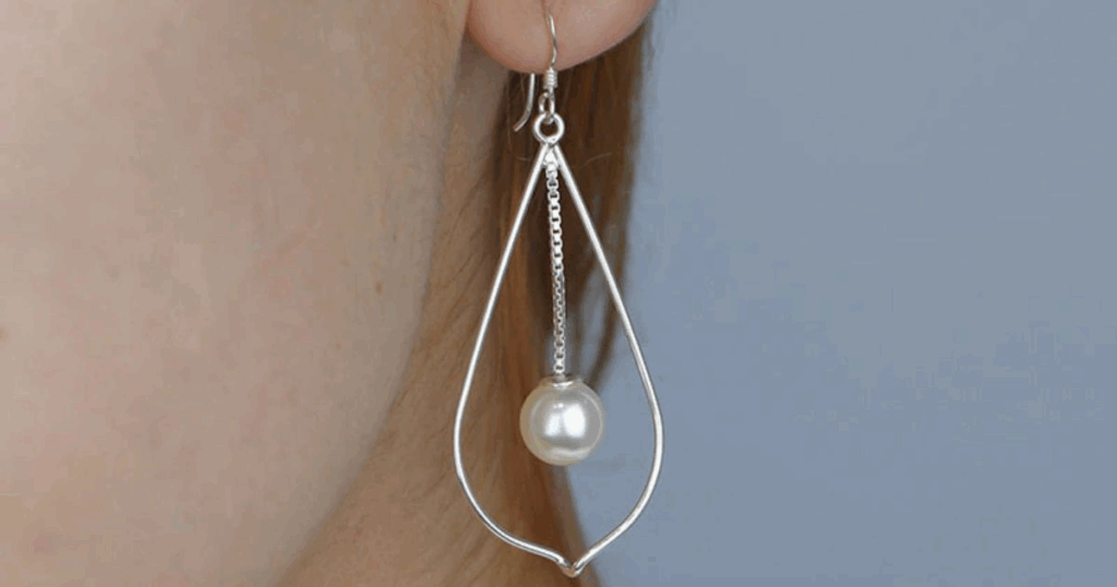 A modelo está usando o Brinco de Prata Gota Vazada com Pérola