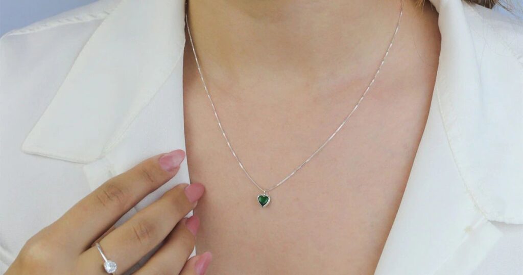 A modelo está usando o Conjunto de Prata Coração Zircônia Verde