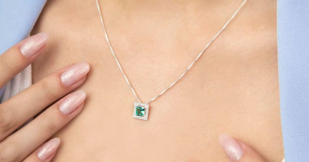 A modelo está usando o Colar de Prata Verde Quadrado Cravejado