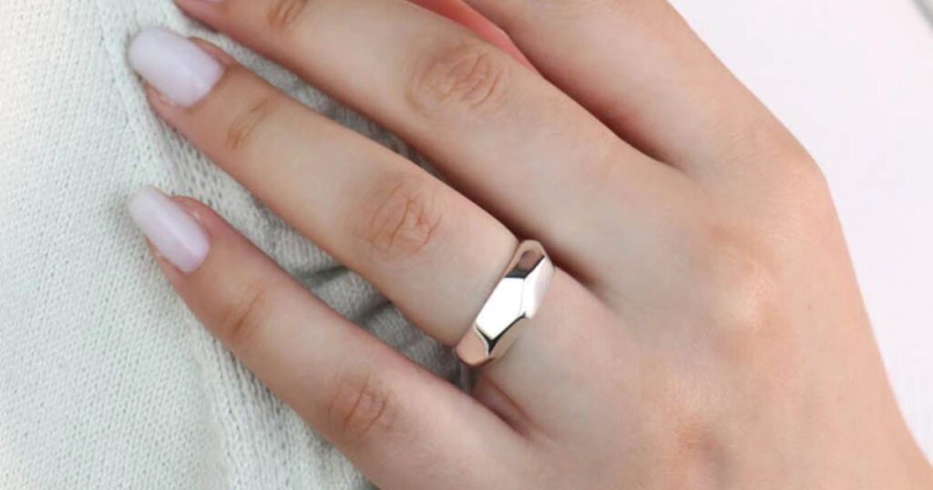 A modelo está usando o Anel de Prata Abaulado Facetado