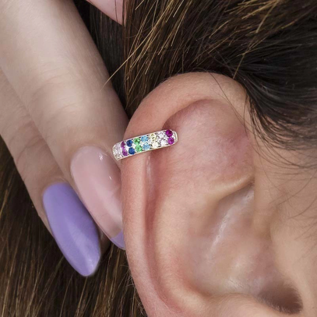 A modelo está usando Piercing de Prata Hélix Aro Cravejado Colorido