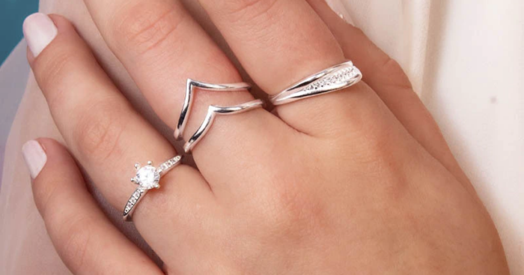 Não tenha medo de brincar com a geometria. Anéis retos ficam lindos quando empilhados com anéis em formato de “V” (chevron) ou ondulados. O encaixe entre eles cria uma silhueta nova e moderna no seu dedo.